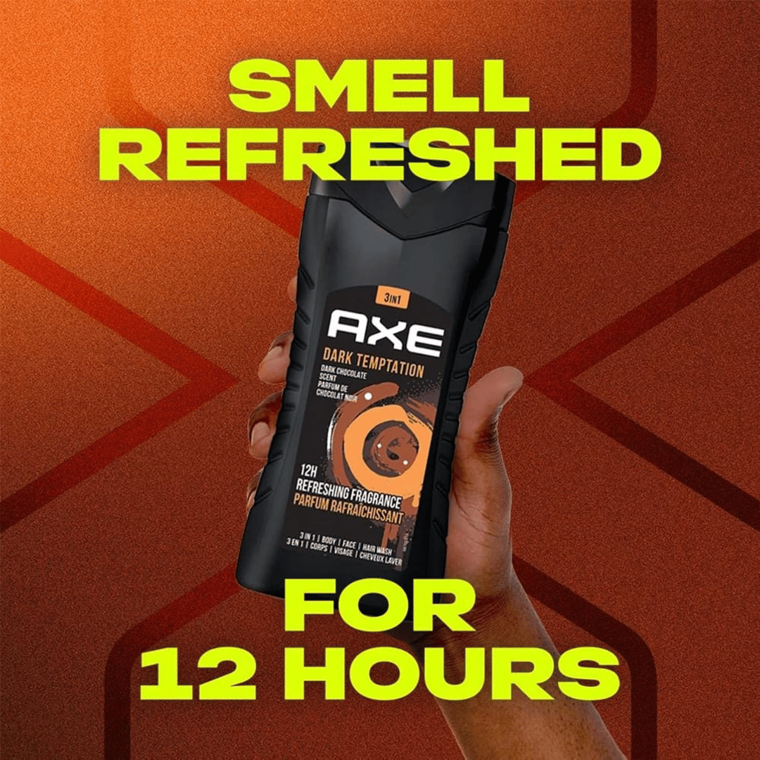 3 In 1, HEAD TO TOE WASH: Axe Dark Temptation is a 3 In 1 moisturizing Body, Face & Hair Wash. An all-in-one grooming kit for men’s daily bathing routine in a shower gel bottle