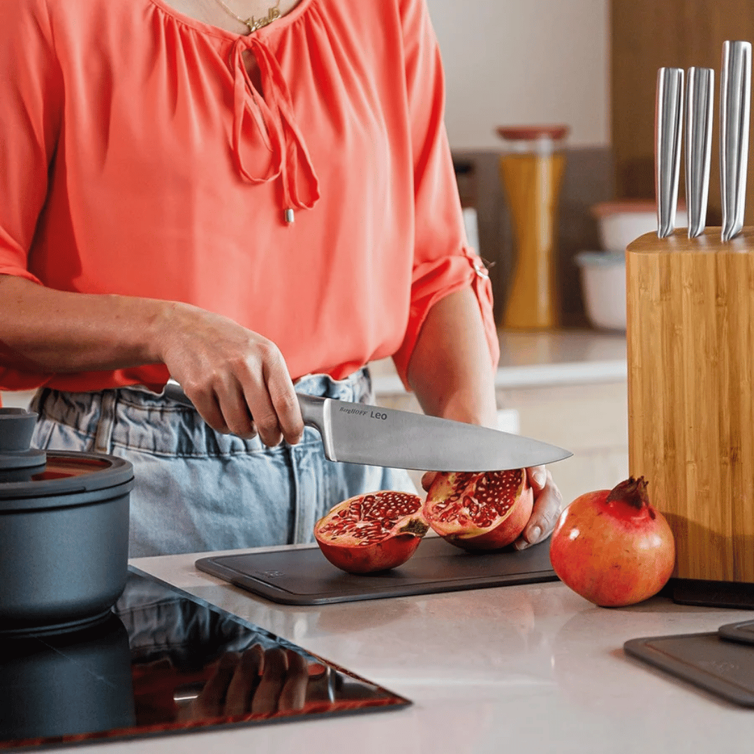 This 3-piece set includes an utility knife, bread knife and chef's knife, the perfect starter knife set in your kitchen! The all-rounder chef's knife is for slicing and dicing, the utility knife cleanly cuts foods with a hard exterior and soft interior, and the bread knife cuts bread in even slices for a perfect start of your day.