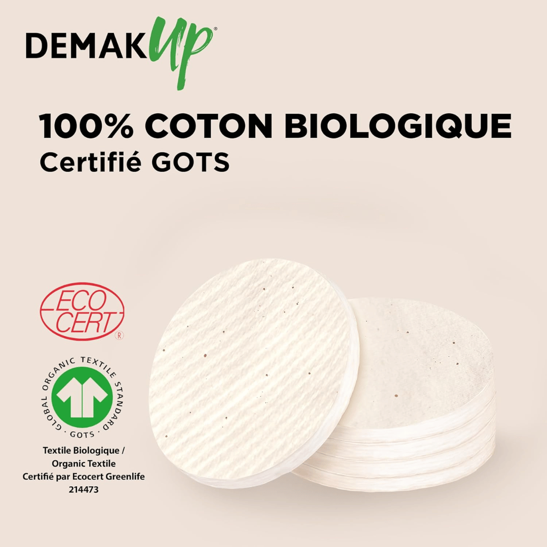 DemakUp Adapt Organic Cotton Pads for Make-Up Removal - Face and Eyes - 100% Natural Organic and Unbleached Cotton Fibers - GOTS Certified - 50 Cotton