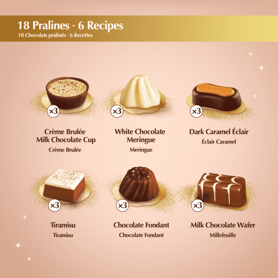 This 18-piece assortment includes caramel eclair, meringue, hazelnut, millefeuille, tiramisu, chocolate fondant, and crème brûlée desserts packaged in an elegant creme-coloured box.